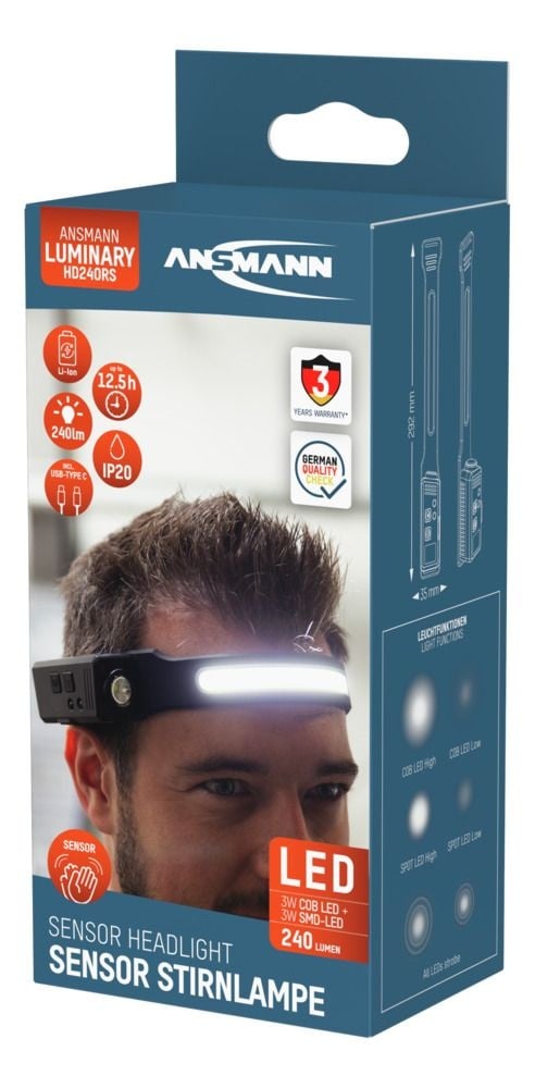 De ANSMANN HD240RS hoofdlamp is een krachtige en veelzijdige oplaadbare lamp met een lichtopbrengst tot 240 lumen. Dankzij de combinatie van COB- en spot-LED, sensorbediening en USB-C opladen is deze hoofdlamp ideaal voor zowel professioneel gebruik als outdoor activiteiten.