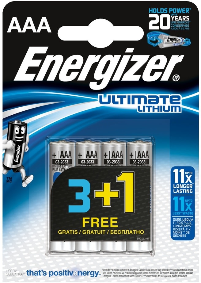 Vergeleken met Energizer Max alkaline batterijen, zijn Energizer Ultimate lithium batterijen 30% lichter van gewicht en gaan ze tot 11 keer langer mee*. Daarnaast hebben Ultimate lithium batterijen een lekvrije constructie en een houdbaarheid van bijna 20 jaar.