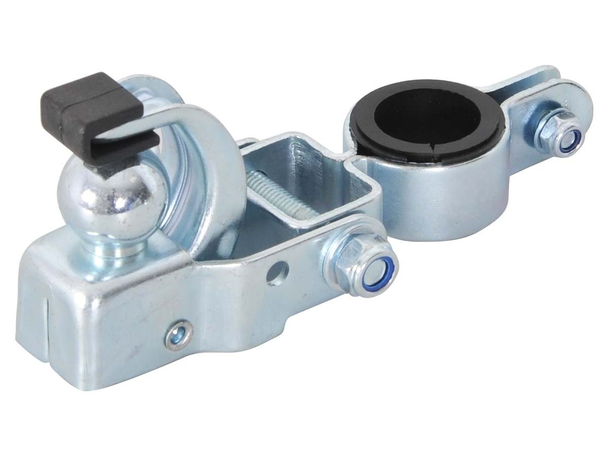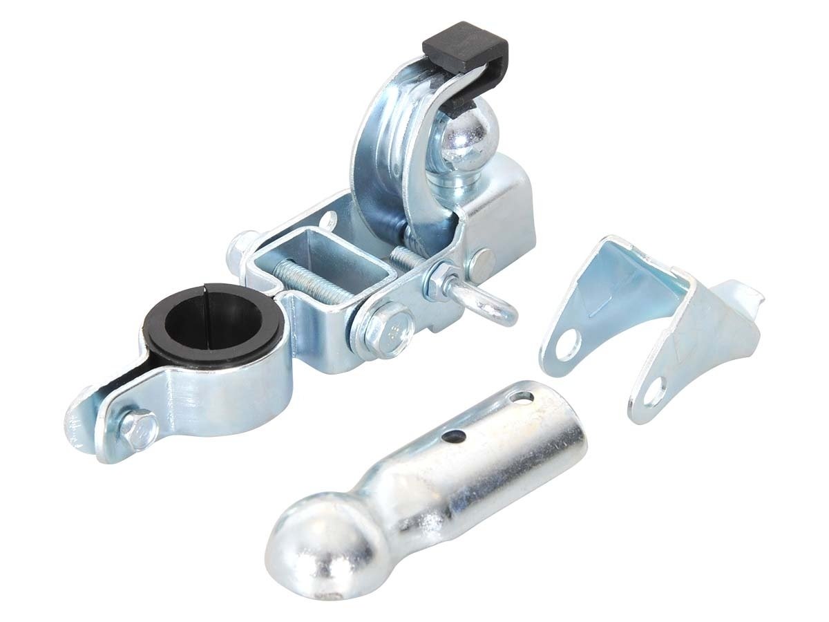 De koppeling bestaat uit een stevig stalen systeem met een koppelkogel en een extra veiligheidsbeugel. Deze beugel wordt vastgezet met een oogbout, waardoor de koppeling niet ongewenst kan loskomen tijdens het gebruik. Dit zorgt voor extra veiligheid tijdens het fietsen.