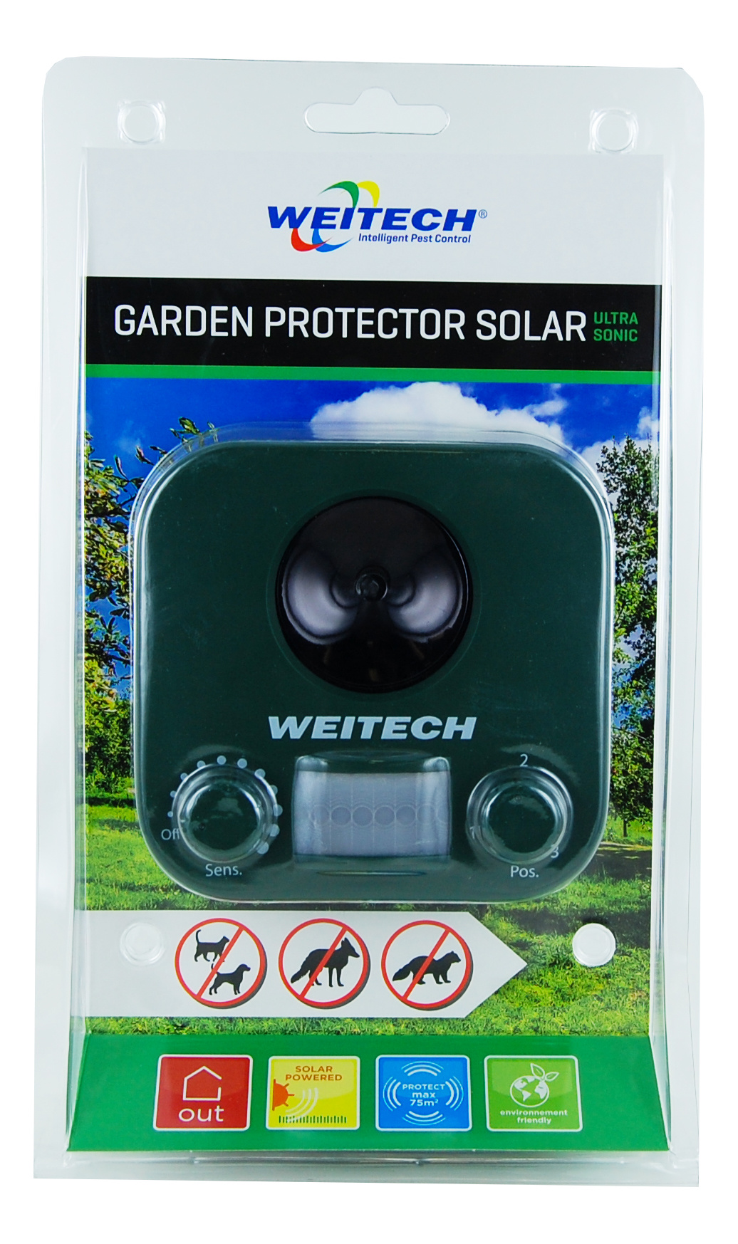 Verjaagt honden, katten, vossen, konijnen, steenmarters, reigers enz. uit tuinen en van terrassen met behulp van ultrasone trillingen.