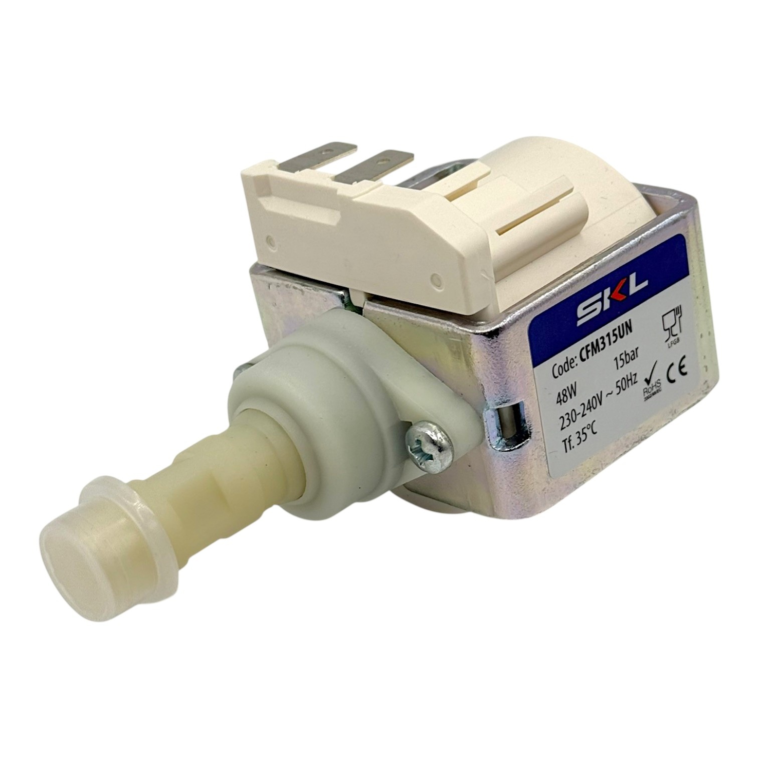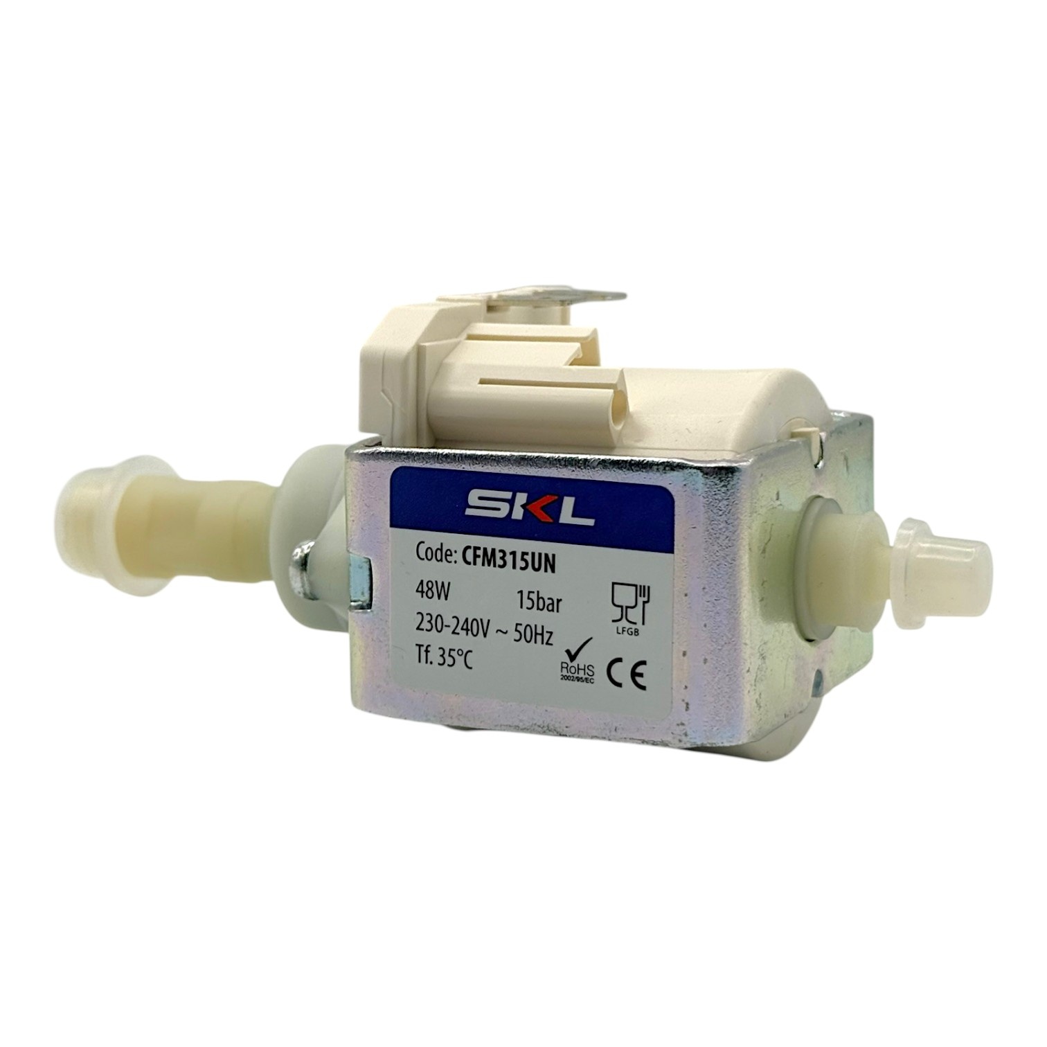 Deze SKL pomp voor koffiemachines is een krachtige waterpomp die wordt toegepast in verschillende koffieapparaten. De pomp werkt op 230 Volt met een vermogen van 48 Watt en levert een druk van 15 bar. Dankzij de specificaties is deze pomp geschikt als alternatief voor de Ulka EP5GW.