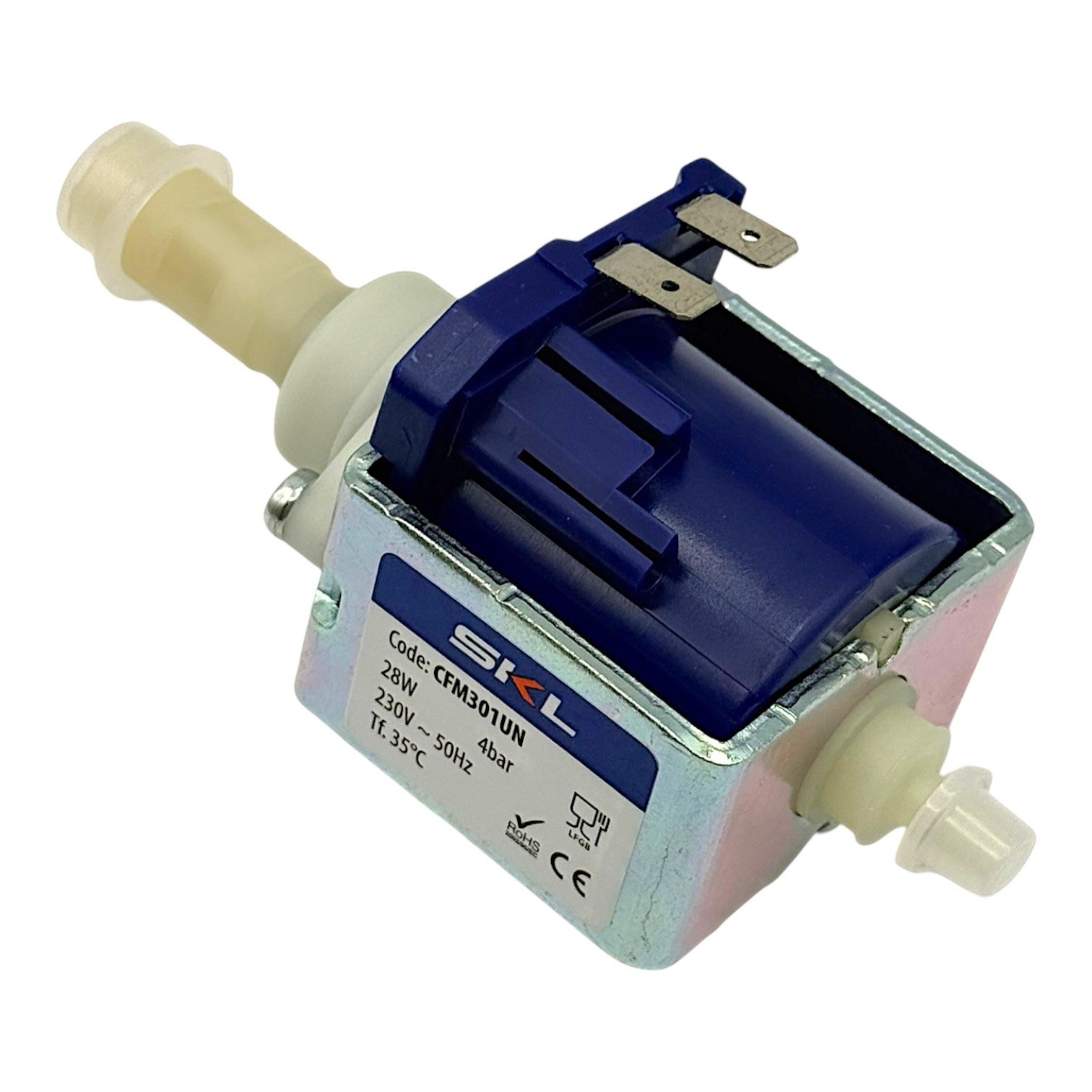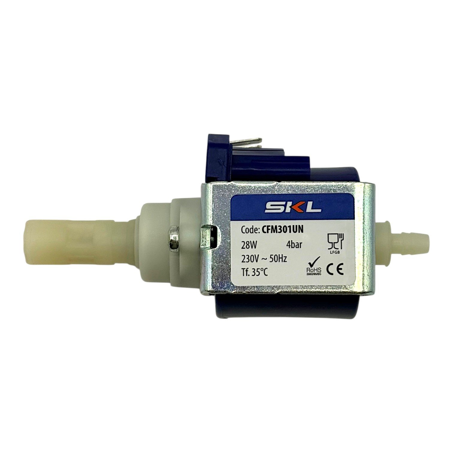 Deze SKL pomp voor koffiemachines is een universele waterpomp die wordt toegepast in verschillende koffieapparaten. De pomp werkt op 230 Volt met een vermogen van 28 Watt en levert een druk van 4 bar. Dankzij de aansluitingen en specificaties is deze pomp geschikt als alternatief voor de Ulka EP77.