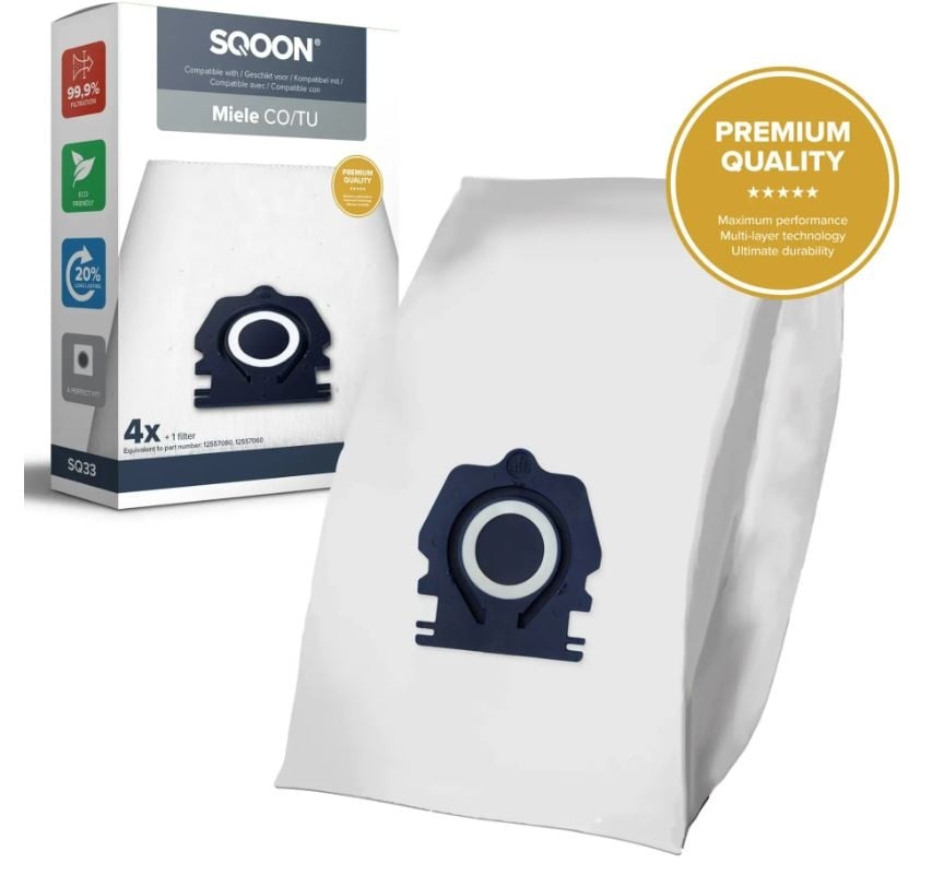 De SQOON stofzuigerzakken zijn ontworpen voor gebruik in diverse Miele Guard-series stofzuigers met CO- en TU-type zakken. Deze set bevat 4 stofzuigerzakken en 1 uitblaasfilter met High Filtration werking. Dit betreft een alternatief onderdeel en geen origineel Miele onderdeel.